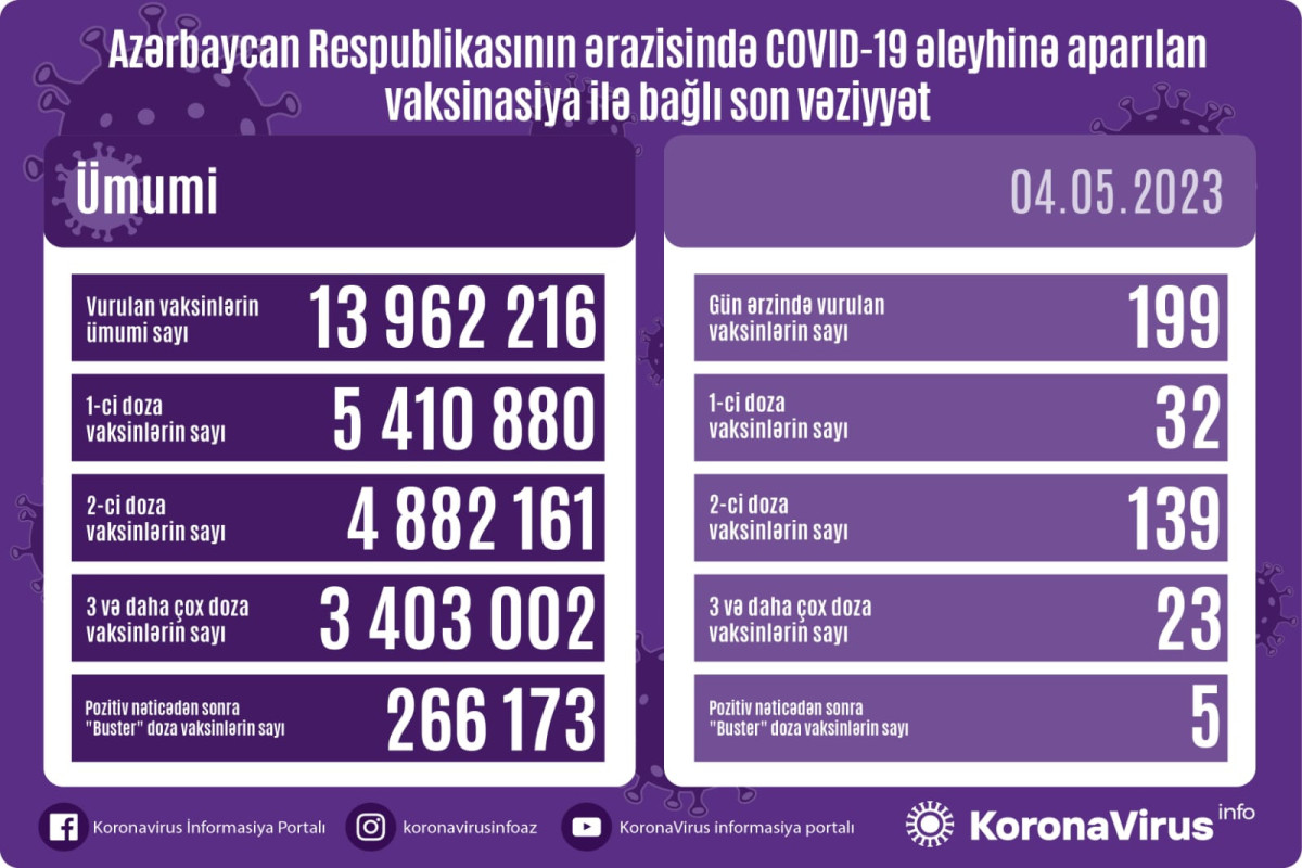 Azərbaycanda son sutkada koronavirus (COVID-19) əleyhinə 199 vaksin vurulub. Bir gündə birinci mərhələ üzrə vaksinasiya olunanların sayı 32, ikinci mərhələ üzrə vaksinasiya olunanların sayı 139, üç və daha çox doza üzrə vaksinasiya olunanların sayı 23, pozitiv nəticədən sonra buster doza üzrə vaksinasiya olunanların sayı 5 nəfərdir.