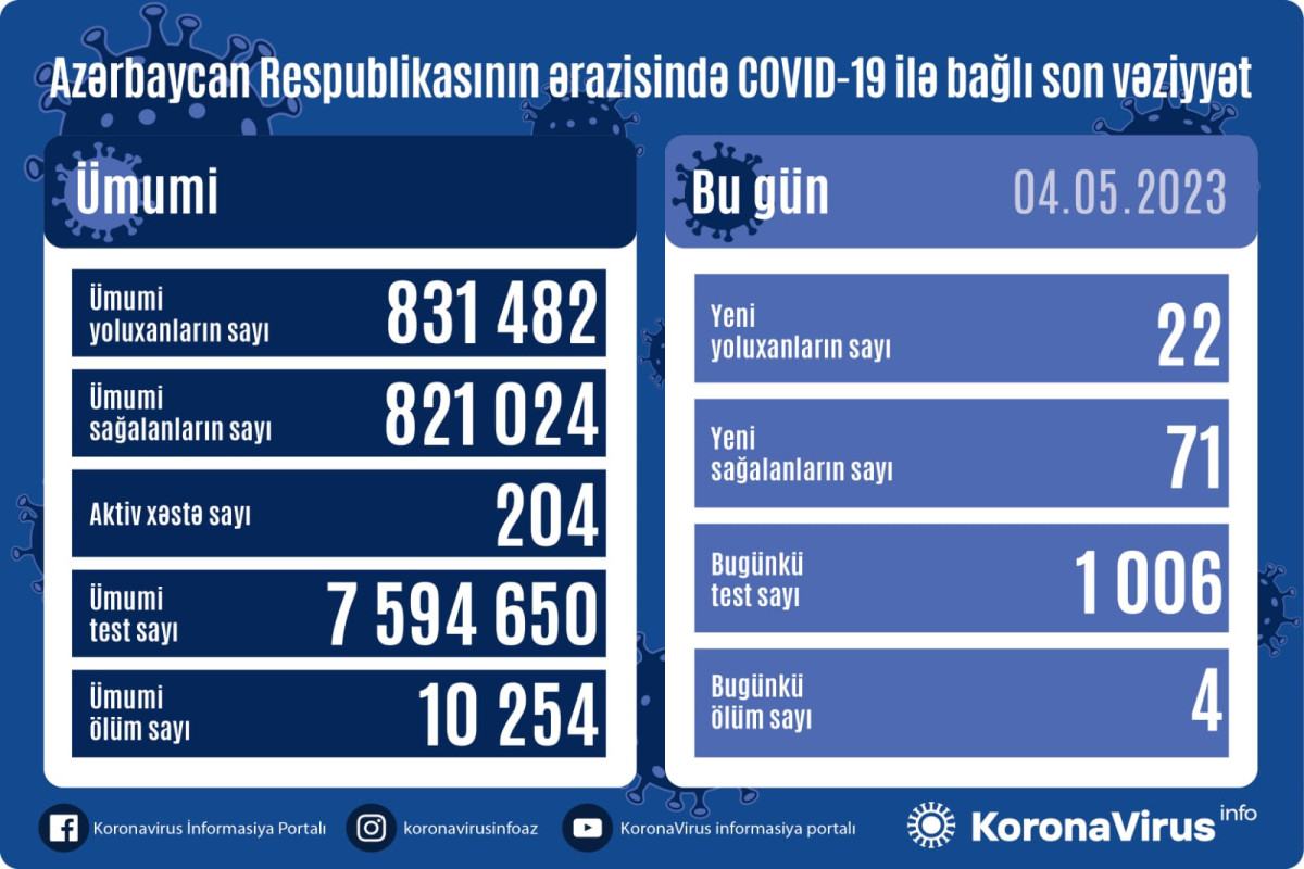 Azərbaycan Respublikasında koronavirus (COVID-19) infeksiyasına 22 yeni yoluxma faktı qeydə alınıb, 71 nəfər müalicə olunaraq sağalıb.