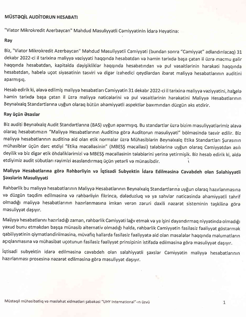 BOKT "Viator Mikrokredit Azərbaycan" MMC-nin 2022-ci ilin sonuna olan maliyyə və audit hesabatı ilə buradan tanış ola bilərsiniz.