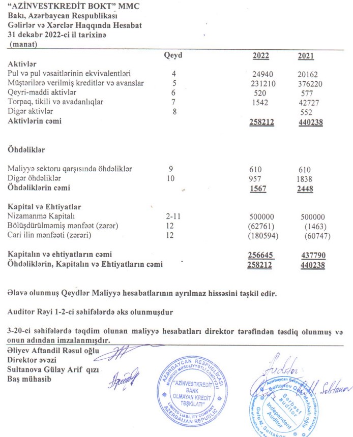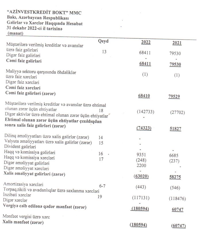 "Azinvestkredit BOKT" MMC 2022-ci ili 180 min 594 manat xalis zərər ilə başa vurub. Təşkilat 2021-ci ili 60 min 747 manat xalis zərər ilə bağlamışdı. Beləliklə, "Azinvestkredit"in xalis zərəri 3 dəfə artıb.