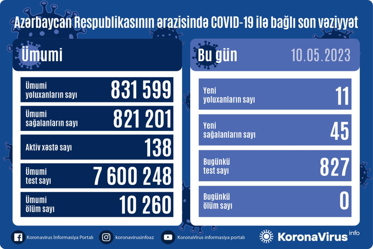 Azərbaycan Respublikasında koronavirus (COVID-19) infeksiyasına 11 yeni yoluxma faktı qeydə alınıb, 45 nəfər müalicə olunaraq sağalıb.