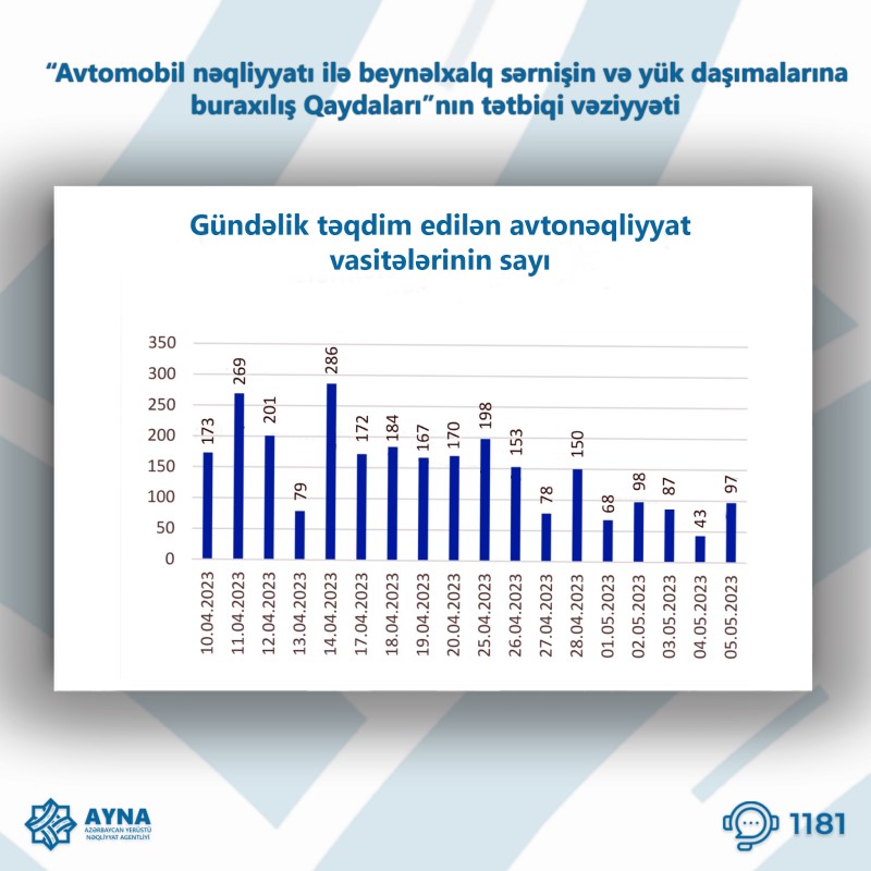 Rəqəmsal İnkişaf və Nəqliyyat Nazirliyinin yaydığı məlumatda bildirilir ki, bu vaxta kimi “Buraxılış vəsiqəsi” və “Buraxılış kartı” almaq üçün 934 daşıyıcı 6128 nəqliyyat vasitəsilə müraciət edib. Sənədləri buraxılış qaydalarının şərtlərinə uyğun olan 889 daşıyıcıya “Buraxılış vəsiqəsi” təqdim olunub. “Buraxılış kartı” alan nəqliyyat vasitələrinin sayı isə 5863-dür.