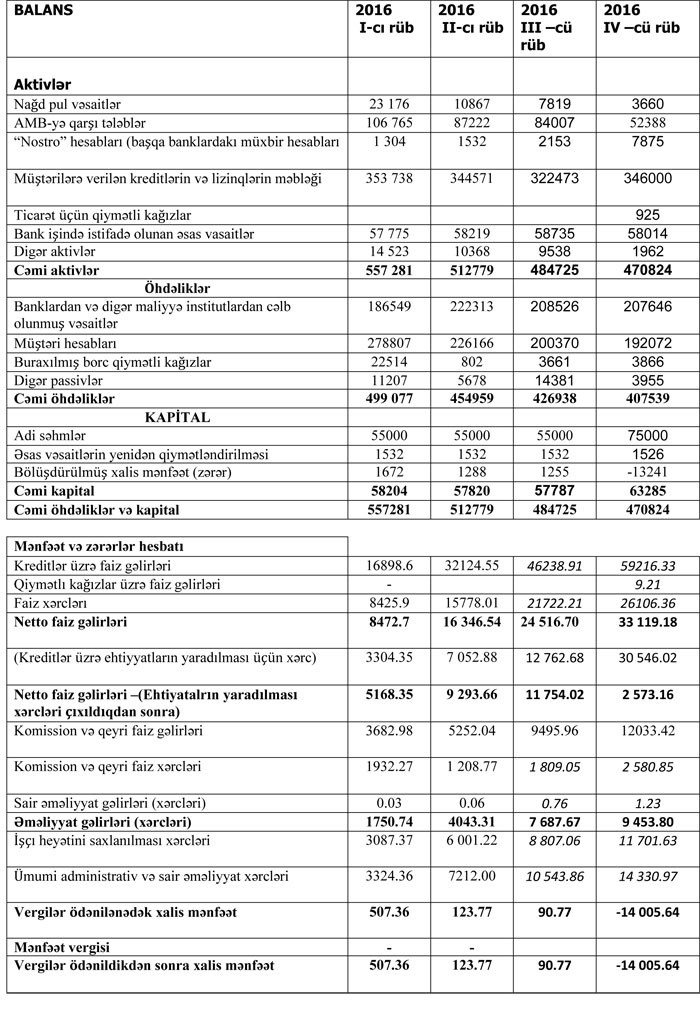 Cari ilin ikinci rübündə birinci rüblə müqayisədə, Bankın aktivəri 465,4 milyon manatdan 407,5 milyon manata, öhdəlikləri 401,6 milyon manatdan 343,9 milyon manata, cəmi balans kapitalı isə 63,8 milyon manatdan 63,52 milyon manata geriləyib.