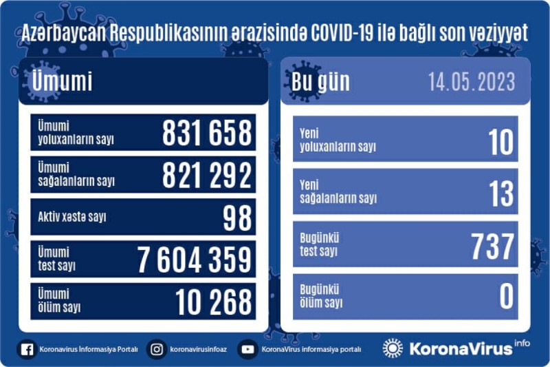 Azərbaycanda koronavirus (COVID-19) infeksiyasına 10 yeni yoluxma faktı qeydə alınıb, 13 nəfər müalicə olunaraq sağalıb.