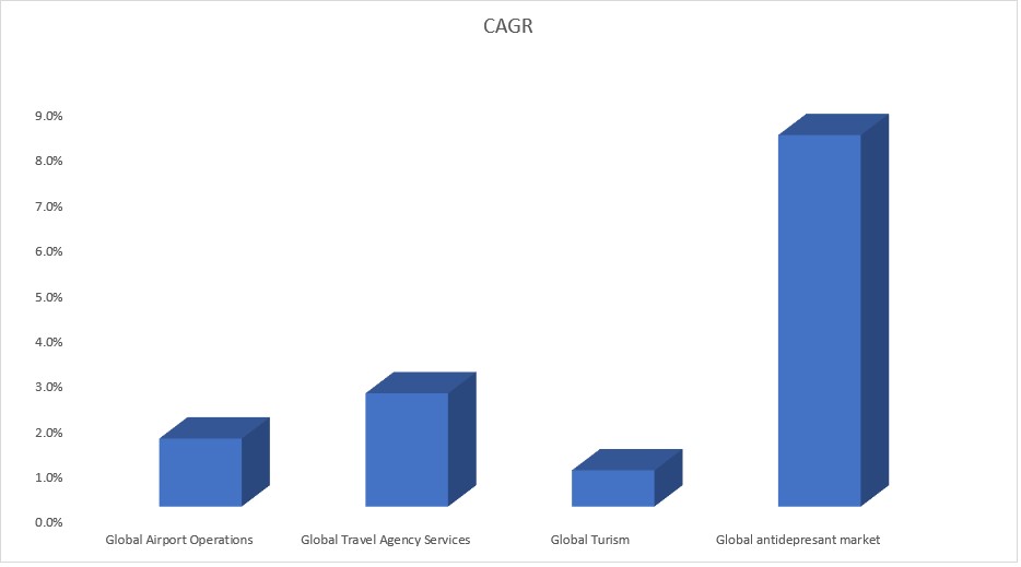 Təsvir olunan mənzərədən aydın görsənir ki, qlobal antidepressant bazarı dünyanın həcminə görə ən böyük bazarlarından ən az 5 dəfə daha yüksək sürətlə böyüyür.