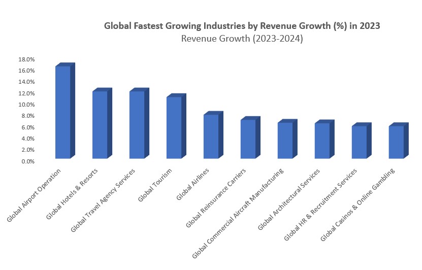 Qeyd edək ki, “IBISWorld” təşkilatı tərəfindən yayımlanan və 2023 -2024-cü illərdə gəlir həcminə görə ən sürətlə böyüyən 10 global sənaye arasında 300 milyard dollarla ilk yeri tutan Qlobal Hava Limanı Əməliyyatlarının illik böyümə sürəti toplam 1.5% təşkil edir. Eyni hesabatda ilk 5-likdə yerləşən Qlobal Səyahət Agentlikləri Xidmətləri və Qlobal Turizm isə müvafiq olaraq 2.5% və 0.8% illik birləşmiş böyümə indeksinə sahib olacaqlar.