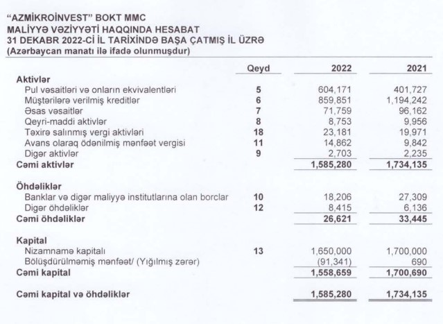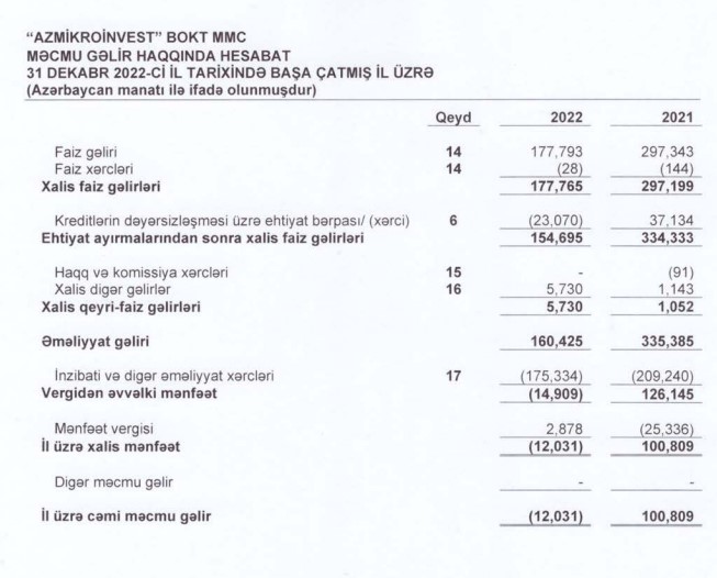 “Azmikroinvest" BOKT MMC 2022-ci ili 12 min 31 manat xalis zərər ilə başa vurub. Təşkilat 2021-ci ili 100 min 809 manat xalis mənfəət ilə bağlamışdı.