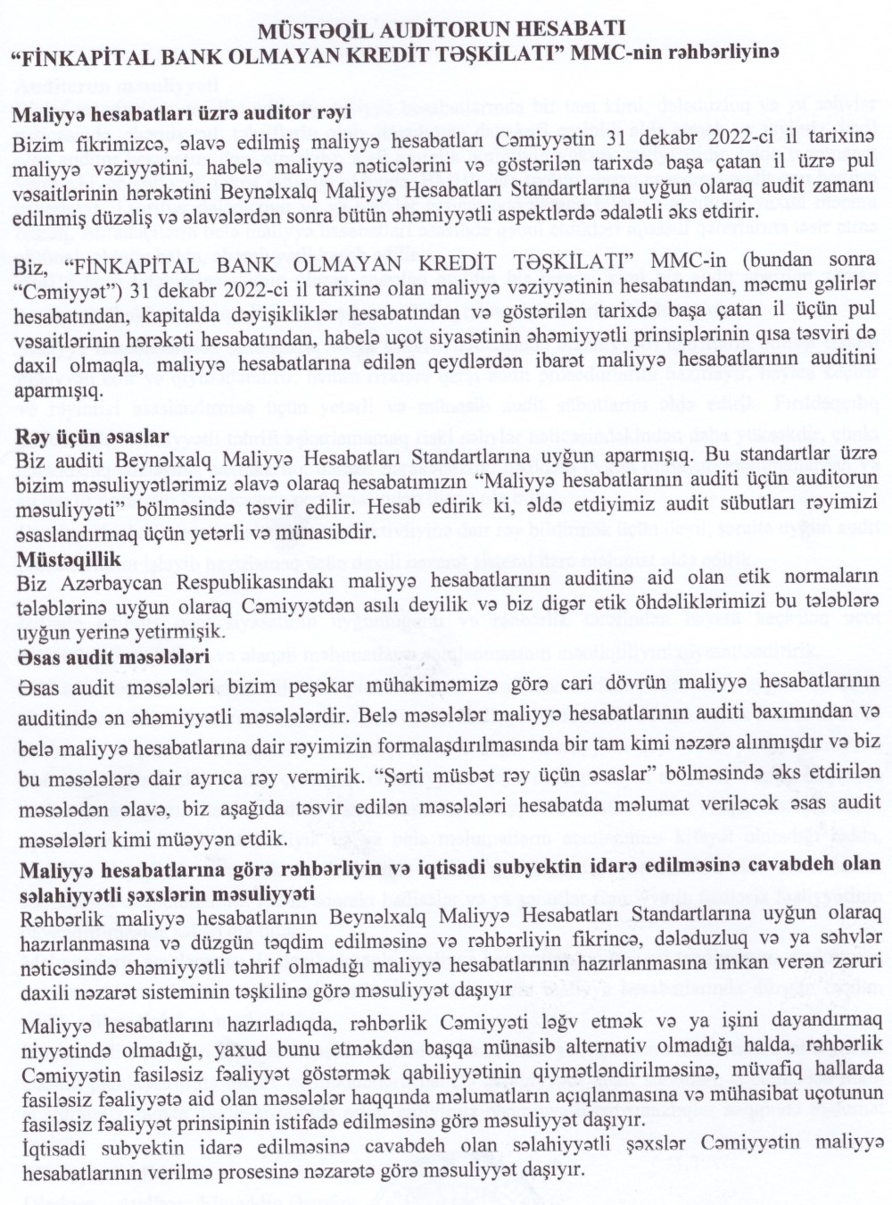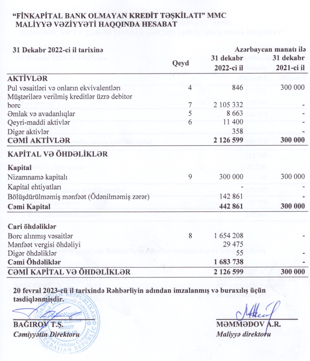 "FinKapital Bank Olmayan Kredit Təşkilatı" MMC-nin 31 dekabr 2022-ci il tarixində bitən il üzrə maliyyə hesabatları.2022-ci ilin yanvar ayında faktiki fəaliyyətə başlamış "FinKapital Bank Olmayan Kredit Təşkilatı" ilk ilini 142 min 861 manat xalis mənfəət ilə başa vurub.