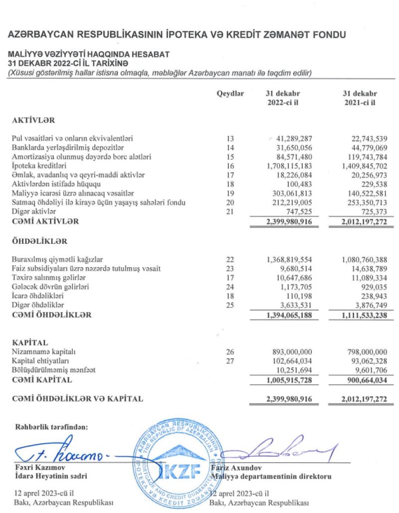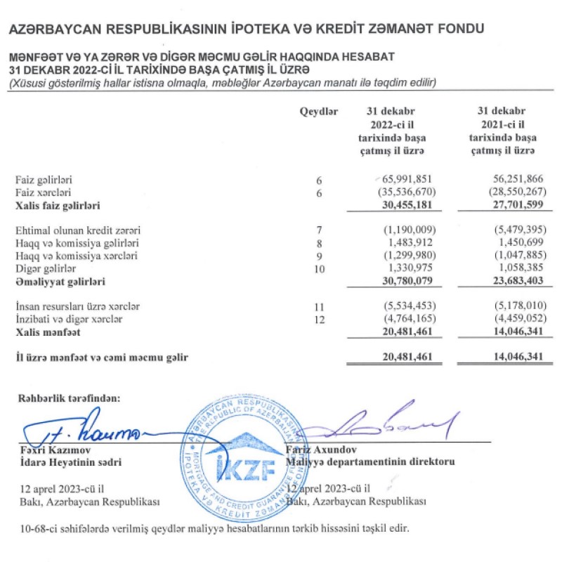 Azərbaycan Respublikasının İpoteka və Kredit Zəmanət Fondu (İKZF) 2022-ci ili 20 milyon 481 min manat xalis mənfəət ilə başa vurub. Fond 2021-ci ili 14 milyon 46 min manat xalis mənfəət ilə bağlamışdı. Beləliklə, İpoteka və Kredit Zəmanət Fondunun xalis mənfəəti 2022-ci ildə 2021-ci illə müqayisədə 6 milyon 435 min manat və ya 45,8% artıb.