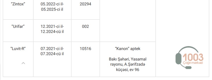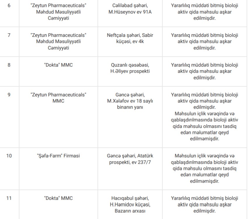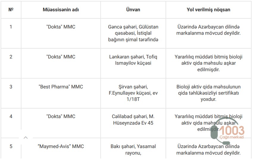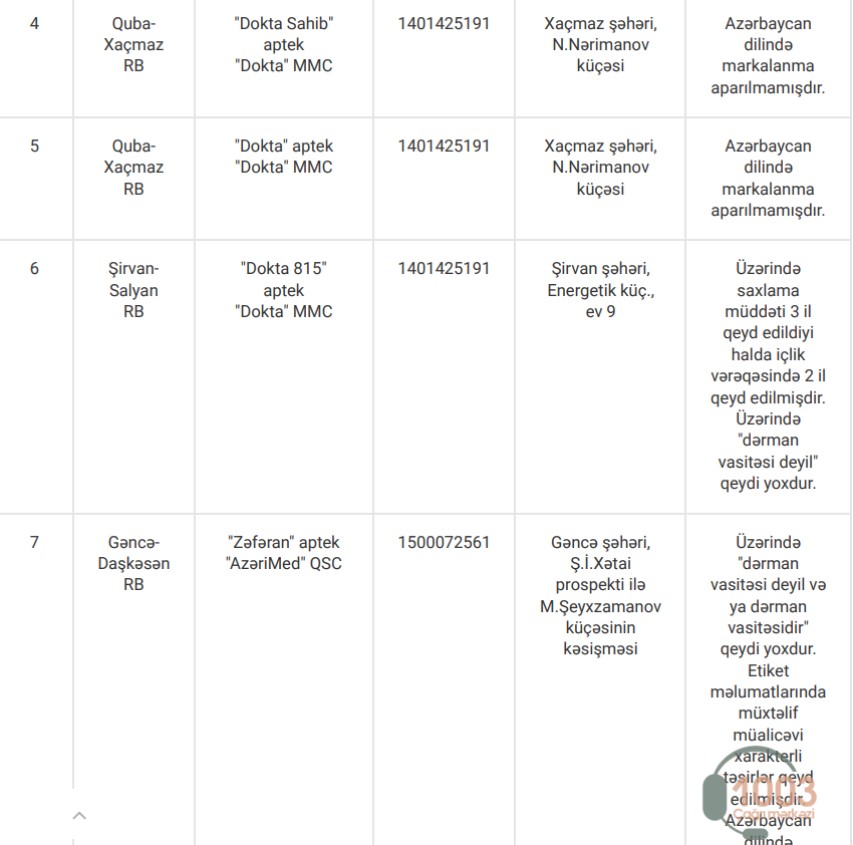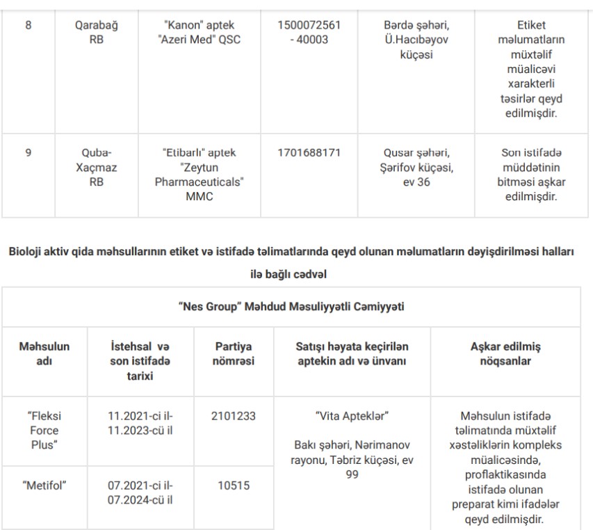 Yoxlamalar zamanı nöqsan aşkar edilən apteklər, həmçinin bioloji aktiv qida məhsullarının etiket və istifadə təlimatlarında qeydə alınan uyğunsuzluqlarla aşağıdakı cədvəllər vasitəsilə tanış ola bilərsiniz: