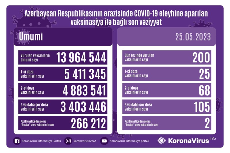 Azərbaycanda son sutkada koronavirus (COVID-19) əleyhinə 200 vaksin vurulub. Bir gündə birinci mərhələ üzrə vaksinasiya olunanların sayı 25, ikinci mərhələ üzrə vaksinasiya olunanların sayı 68, üç və daha çox doza vaksin vurduranların sayı 105, pozitiv nəticədən sonra buster doza üzrə vaksinasiya olunanların sayı isə 2 nəfərdir.