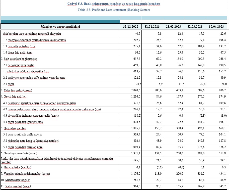 2023-cü ilin yanavar-aprel dövründə bankların faiz gəlirləri 1 milyard 97 milyon 100 min manata, qeyri-faiz gəlirləri isə 374 milyon 935 min manat təşkil edib.