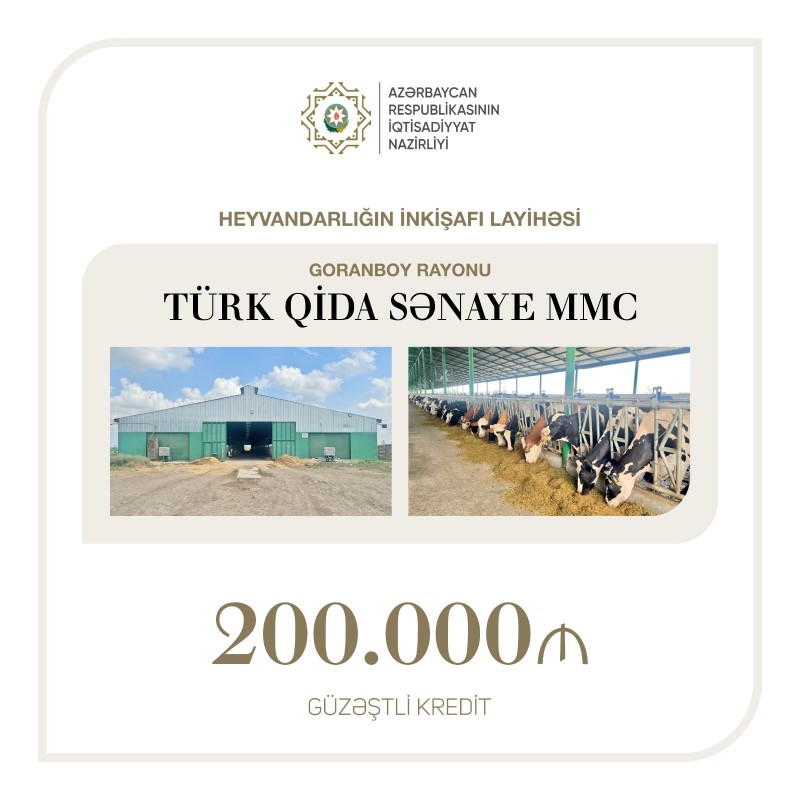 Sahibkarlığın İnkişafı Fondundan "Türk Qida Sənaye" MMC-yə heyvandarlığın inkişafı layihəsi üçün 200 min manat güzəştli kredit verilib.