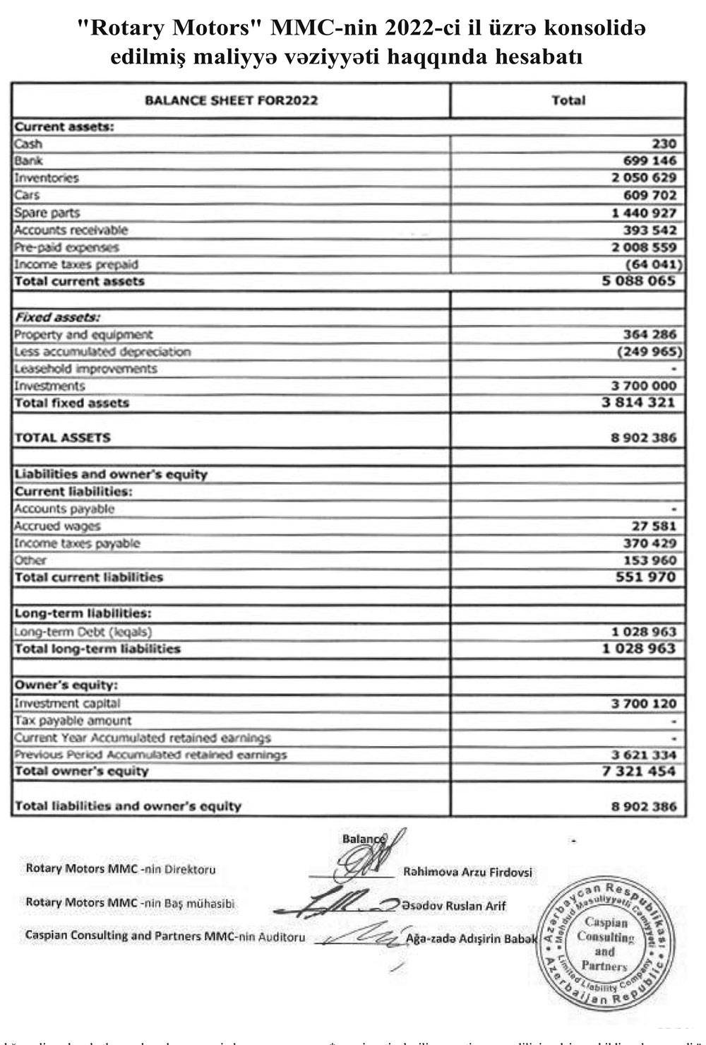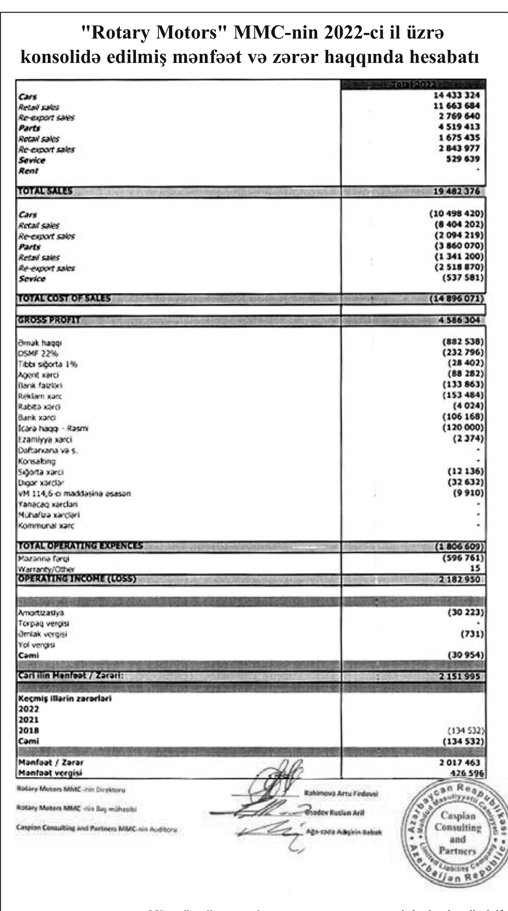 Xatırladaq ki, Azərbaycanda Mazda avtomobillərinin rəsmi idxalçısı “Rotary Motors” MMC və Subaru avtomobillərinin rəsmi idxalçısı “Subaru Azərbaycan” MMC ötən il 2021-ci il üzrə konsolidə edilmiş hesabat dərc etmişdilər. Hesabatda qeyd edilmişdi ki, Ötən il iki şirkətin avtomobil satışından cəmi gəlirləri 10 milyon 41 min manat, o cümlədən “Rotary Motors”un gəlirləri 8 milyon 583 min manat, “Subaru Azərbaycan”ın gəlirləri 1 milyon 458 min manat təşkil edib. 2021-ci ildə iki şirkətin cəmi xalis mənfəəti 438 min manat, o cümlədən “Rotary Motors”un xalis mənfəəti 423 min manat, “Subaru Azərbaycan”ın xalis mənfəəti 15 min manat təşkil etmişdi. 2017 cə 2018-ci illərdə “Subaru Azərbaycan”ın yığılmış 439 min 849 manat xalis zərəri nəzərə alındıqda qrup 2021-ci ili 1577 manat xalis zərər ilə bağlamışdı.