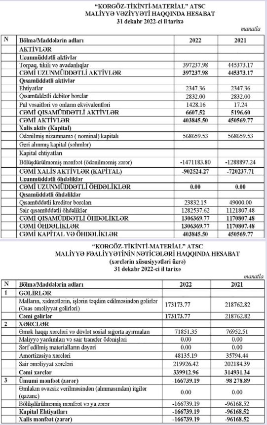 "Korgöz-Tikinti-Material" ATSC 2022-ci ili 167 min manat xalis zərər ilə başa vurub. Şirkət 2021-ci ili 96 min manat xalis zərər ilə bağlamışdı.