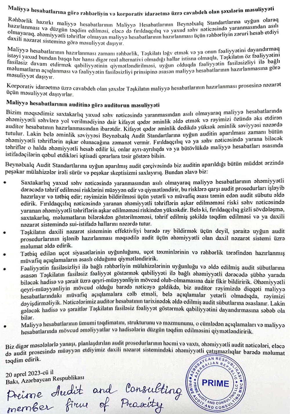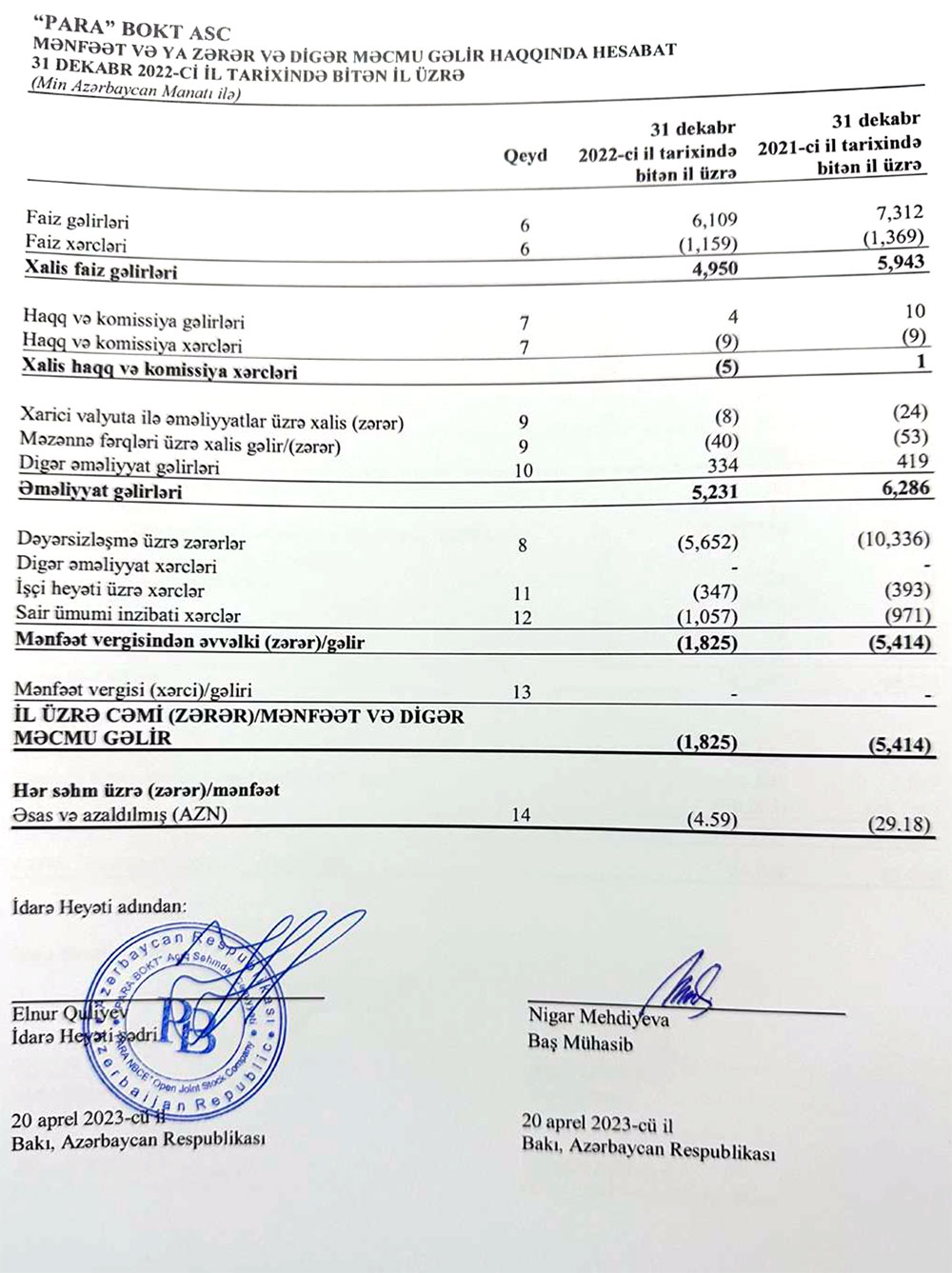 "Para Bank Olmayan Kredit Təşkilatı" ASC 31 dekabr 2022-ci il tarixində bitən il üzrə maliyyə hesabatını dərc edib.