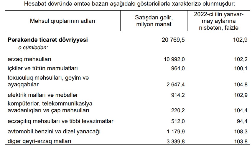 Dövlət Statistika komitəsinin yaydığı məlumata görə, 2022-ci ilin yanvar-may ayları ilə müqayisədə pərakəndə ticarət dövriyyəsi real ifadədə 2,9 faiz, o cümlədən ərzaq məhsulları, içkilər və tütün məmulatları üzrə 2,0 faiz, qeyri-ərzaq malları üzrə 4,1 faiz artmışdır.