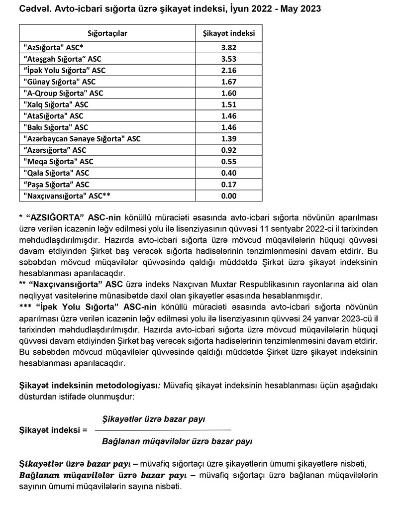 Şikayət indeksinə görə, indeksin 1.00-dәn aşağı olması hәmin portfel üzrә xidmәt sәviyyәsinin digәr şirkәtlәrlә nisbәtdә yaxşı olduğunu, lakin 1.00-i üstәlәmәsi xidmәt sәviyyәsinin digәr şirkәtlәrә nәzәrәn aşağı olduğunu göstәrir.