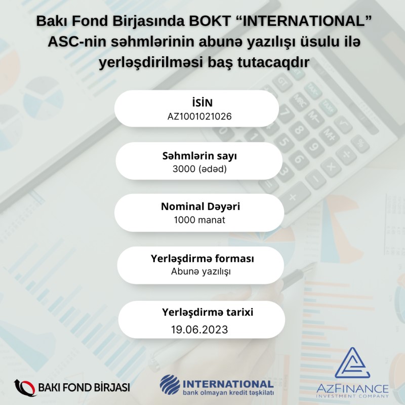 19 iyun 2023-cü ildə BOKT “İnternational” ASC-nin səhmlərinin abunə yazılışı üsulu ilə yerləşdirilməsi baş tutacaqdır.