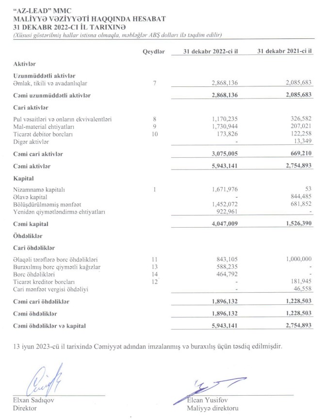 Ötən il "Az-Lead" şirkətinin cəmi aktivləri 3 milyon 188 min manat və ya 2,2 dəfə artaraq 5 milyon 943 min manata çatıb.