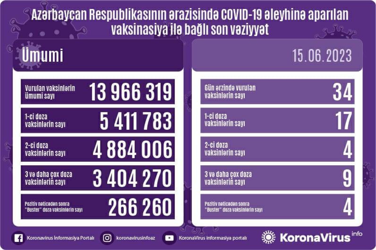 Azərbaycanda son sutkada koronavirus (COVID-19) əleyhinə 34 vaksin vurulub. Bir gündə birinci mərhələ üzrə vaksinasiya olunanların sayı 17, ikinci mərhələ üzrə vaksinasiya olunanların sayı 4, üç və daha çox doza üzrə vaksinasiya olunanların sayı 9, pozitiv nəticədən sonra buster doza üzrə vaksinasiya olunanların sayı 4 nəfərdir.