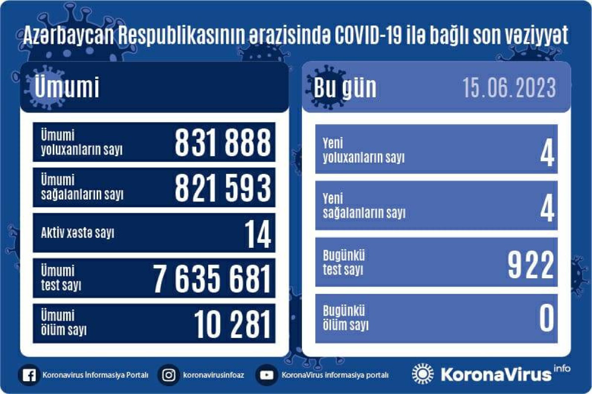 Azərbaycan Respublikasında koronavirus (COVID-19) infeksiyasına 4 yeni yoluxma faktı qeydə alınıb, 4 nəfər müalicə olunaraq sağalıb.