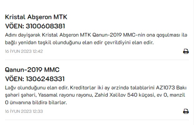 250 manat nizamnamə kapitalı olan "Qanun-2019" MMC ləğv olunduğunu elan edir. Kreditorlar iki ay ərzində tələblərini AZ1073 Bakı şəhəri şəhəri, Yasamal rayonu rayonu, Zahid Xəlilov 540 küçəsi ünvanına bildirə bilərlər.