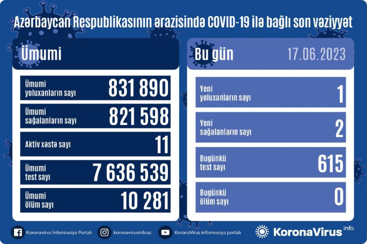 Azərbaycan Respublikasında koronavirus (COVID-19) infeksiyasına 1 yeni yoluxma faktı qeydə alınıb, 2 nəfər müalicə olunaraq sağalıb.