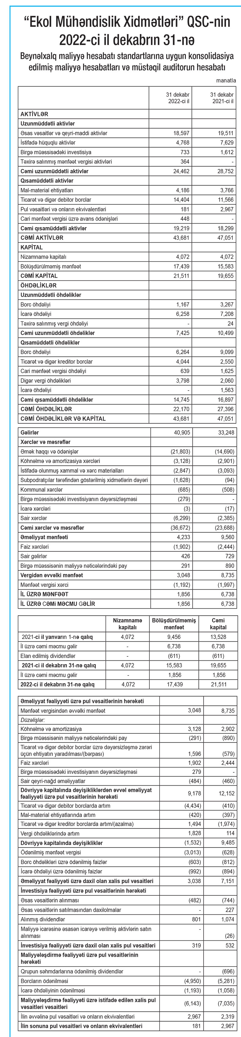 Ətraf mühitin mühafizəsi istiqamətində ekoloji yönümlü layihələr həyata keçirməklə məşğul olan “Ekol Mühəndislik Xidmətləri” QSC 2022-ci ili 1 milyon 856 min manat xalis mənfəət ilə başa vurub. Şirkət 2021-ci ili 6 milyon 738 min manat xalis mənfəət ilə başa vurmudşu. Beləliklə, ötən il “Ekol Mühəndislik Xidmətləri”nin xalis mənfəəti 3,6 dəfə azalıb. Xalis mənfəətin düşməsi xərclər və məsrəflərin gəlirlərdən daha çox artması ilə əlaqədardır.