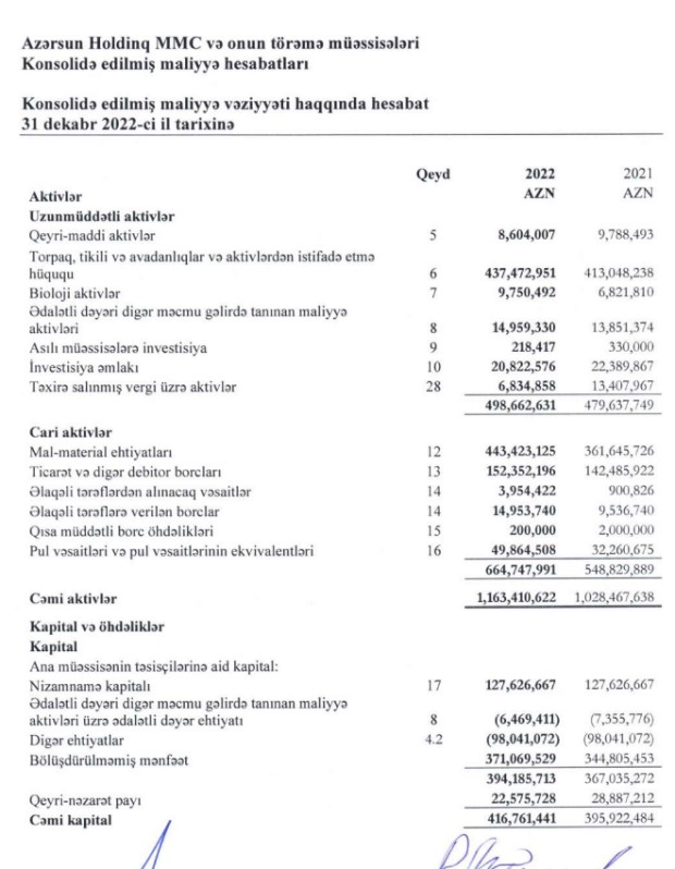 Azərbaycanda iri qida məhsulları istehsalçısı"Azərsun Holdinq" MMC 2022-ci ili 15 miylon 961 min manat xalis mənfəət ilə başa vurub. Holdinq 2021-ci ili 28 milyon 291 min manat xalis mənfəət ilə bağlamışdı.