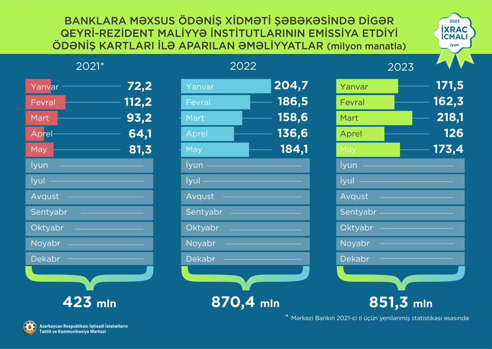 Marja xəbər verir ki, 2023-cü ilin yanvar-may aylarında banklara məxsus ödəniş xidməti şəbəkəsində digər qeyri-rezident maliyyə institutlarının emissiya etdiyi ödəniş kartları ilə 851,3 milyon manat, yalnız may ayında isə 173,4 milyon manat dəyərində əməliyyat aparılıb.