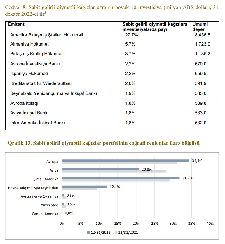 Hesabatda bildirilir ki, ötən il Fondun investisiya gəlirləri olmayıb, əksinə investisiyaları üzrə 2 milyard 461,3 milyon ABŞ dolları (4 milyard 184,21 milyon manat) itki ilə üzləşib. Qeyd edilib ki, 2022-ci ildə ARDNF-nin sabit gəlirli qiymətli kağızlara investisiyalarının gəlirliliyi mənfi (-) 3,8% təşkil etmişdir. Faizlərin ilkin səviyyələrinin aşağı olması və onların qlobal maliyyə böhranından bəri görünməmiş həddə artımı istiqrazların böyük dəyər itirməsinə səbəb olmuşdur.