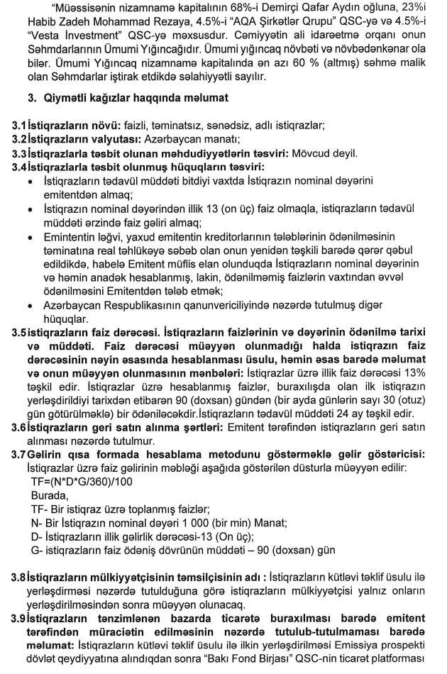 "AQA Şirkətlər Qrupu" QSC-yə daxil olan "Ferrrum Kapital" QSC istiqraz yerləşdirilməsi yolu ilə 2,5 milyon manat borc alır.