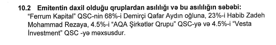 "Ferrum Kapital" QSC-nin səhmdarları 2 fiziki (Demirçi Qafar Aydın oğlu (68%) və Habib Zadeh Mohammad Reza (23%)) və 2 hüquqi şəxsdir.