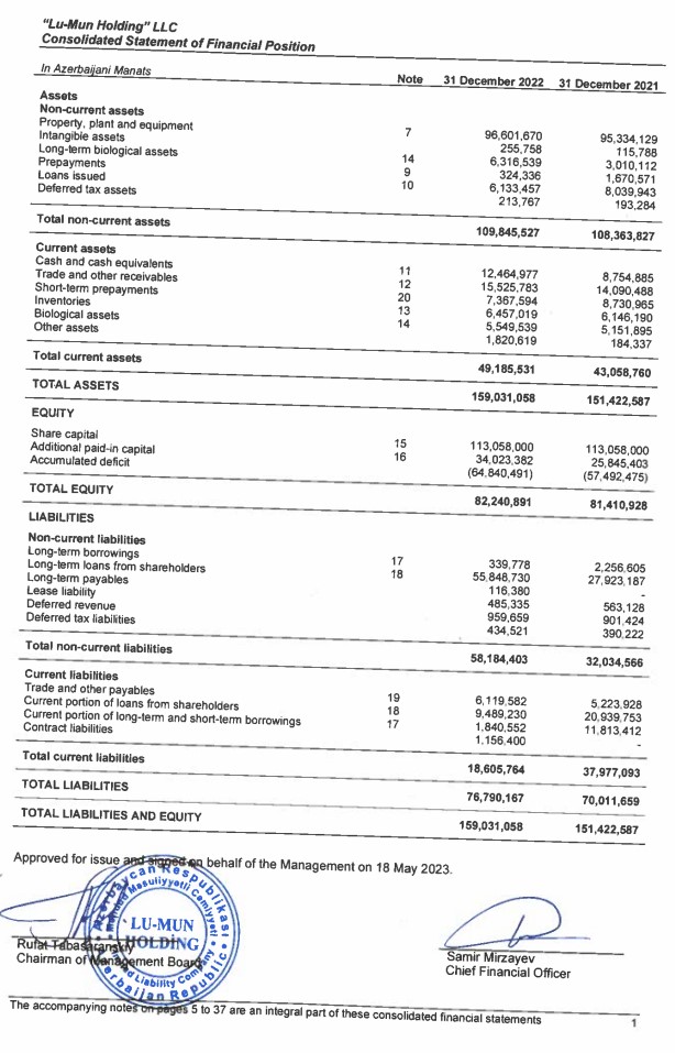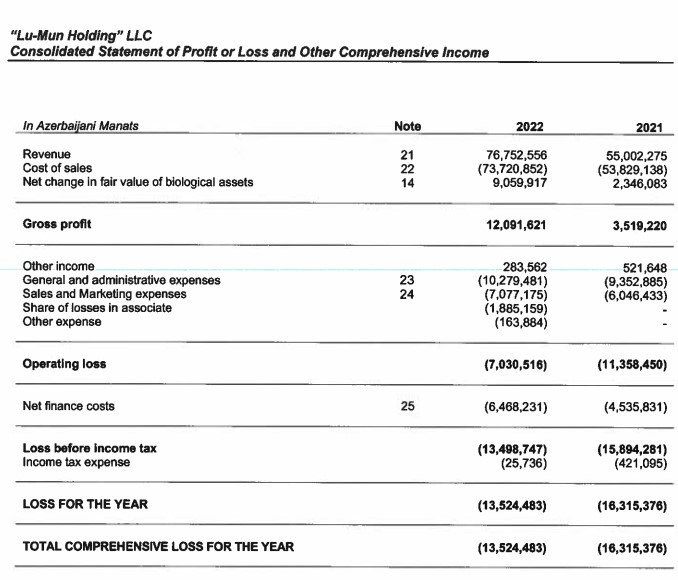 Azərbaycanda kənd təsərrüfatı və qida istehsalı sahələrində irimiqyaslı layihələr həyata keçirən investisiya şirkəti “LU-MUN Holding” MMC 2022-ci il üzrə maliyyə göstəricilərini açıqlayıb.