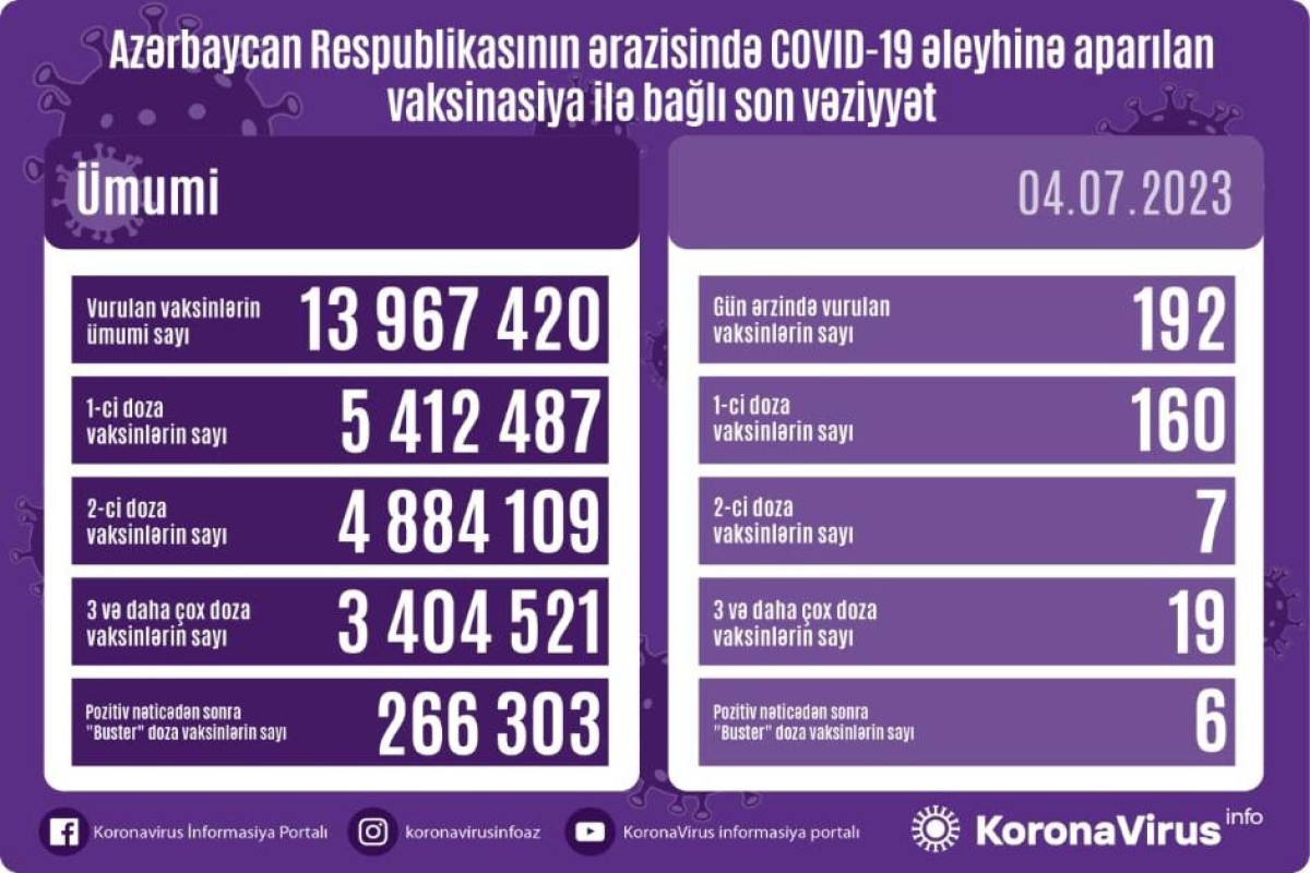Azərbaycanda son sutkada koronavirus (COVID-19) əleyhinə 192 vaksin vurulub. Bir gündə birinci mərhələ üzrə vaksinasiya olunanların sayı 160, ikinci mərhələ üzrə vaksinasiya olunanların sayı 7, üç və daha çox doza vaksin vurduranların sayı 19, pozitiv nəticədən sonra buster doza üzrə vaksinasiya olunanların sayı isə 6 nəfərdir.