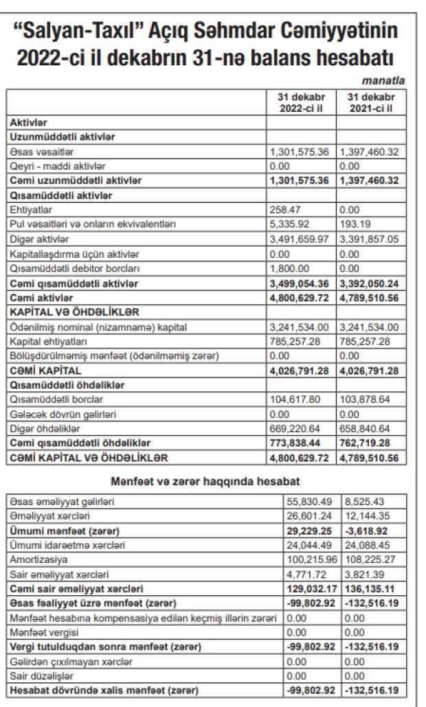 “Salyan-Taxıl” Açıq Səhmdar Cəmi̇yyəti 2022-ci ili 99 min 802 manat xalis zərər ilə başa vurub. Şirkət 2021-ci ili 132 min 516 min manat xalis zərər ilə bağlamışdı.