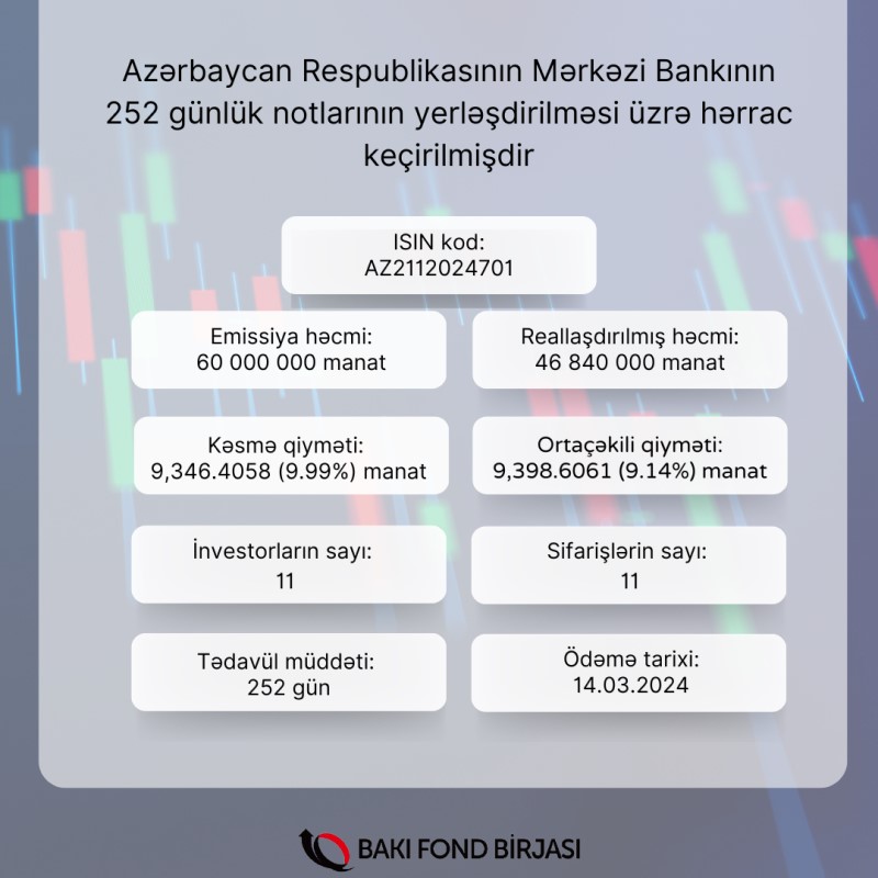 6 iyul 2023-cü il tarixində Bakı Fond Birjasında Azərbaycan Respublikasının Mərkəzi Bankının (ARMB) AZ2112024701 dövlət qeydiyyat nömrəli 60 milyon manat həcmində 252 gün tədavül müddətli notlarının yerləşdirilməsi üzrə hərrac keçirilmişdir.
