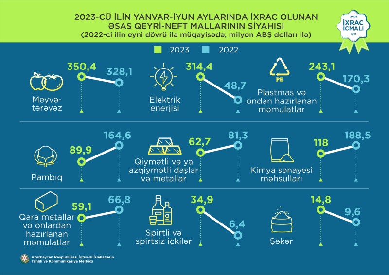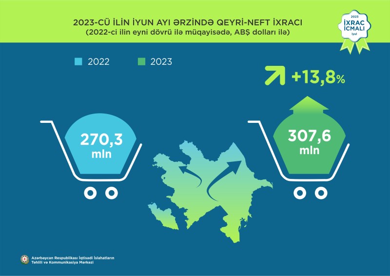 2023-cü ilin iyun ayının qeyri-neft ixracı ötən ilin müvafiq dövrü ilə müqayisədə 13,8% artaraq 307,6 milyon ABŞ dolları təşkil edib. 2023-cü ilin iyun ayı ərzində yeyinti məhsulları üzrə ixrac 4,9% artaraq 125,5 milyon ABŞ dolları, qeyri-yeyinti məhsulları üzrə isə 20,8% artaraq 182,1 milyon ABŞ dollarına bərabər olub.