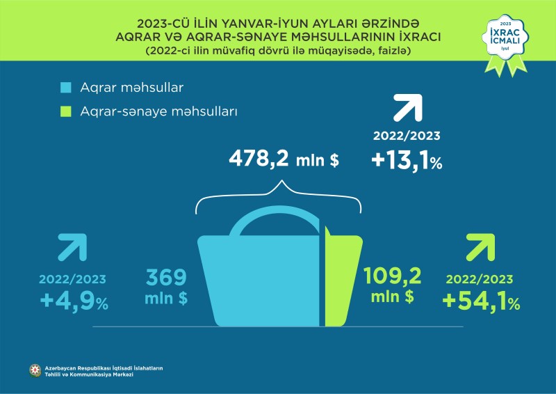 2023-cü ilin yanvar-iyun ayları ərzində aqrar və aqrar-sənaye məhsulları üzrə birgə ixracın statistik dəyəri 13,1% artaraq 478,2 milyon ABŞ dolları təşkil edib. Qeyri-neft-qaz ixracının tərkib hissəsində əhəmiyyətli yer tutan aqrar-sənaye məhsullarının yaratdığı dəyər ötən ilin müvafiq dövrü ilə müqayisədə 54,1% artaraq 109,2 milyon ABŞ dolları təşkil edib.