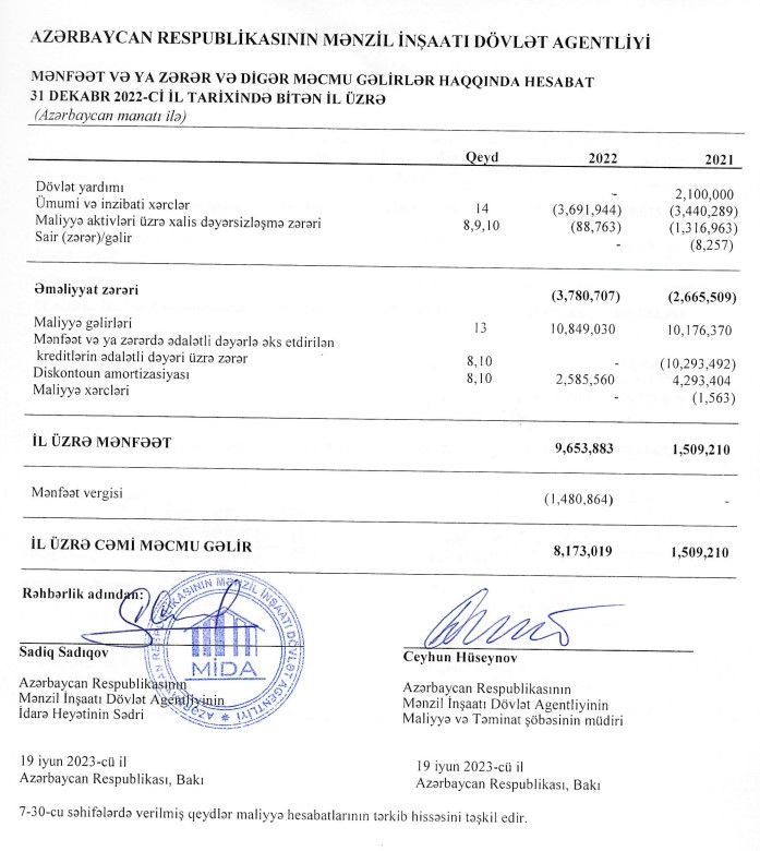 Xəbər verdiyimiz kimi, Azərbaycan Respublikası Mənzil İnşaatı Dövlət Agentliyi (MİDA) 2022-ci ili 8 milyon 173 min manat xalis mənfəət ilə başa vurub. Agentlik 2021-ci ili 1 milyon 509 min manat xalis mənfəət ilə bağlamışdı. Beləliklə, ötən il Agentliyin xalis mənfəəti 5,4 dəfə artıb. Mənzil İnşaatı Dövlət Agentliyinin maliyyə gəliləri 2021-ci ildə 10 milyon 176 min manat ikən, 2022-ci ildə 10 milyon 849 min manata yüksəlib. 2021-ci ildə dövlərdən 2,1 milyon manat yardım almış Agentlik, ötən il dövlətdən yardım almayıb.