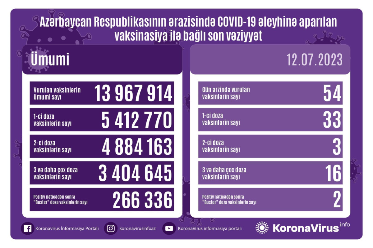 Azərbaycanda son sutkada koronavirus (COVID-19) əleyhinə 54 vaksin vurulub. Bir gündə birinci mərhələ üzrə vaksinasiya olunanların sayı 33, ikinci mərhələ üzrə vaksinasiya olunanların sayı 3, üç və daha çox doza vaksin vurduranların sayı 16, pozitiv nəticədən sonra buster doza üzrə vaksinasiya olunanların sayı isə 2 nəfərdir.
