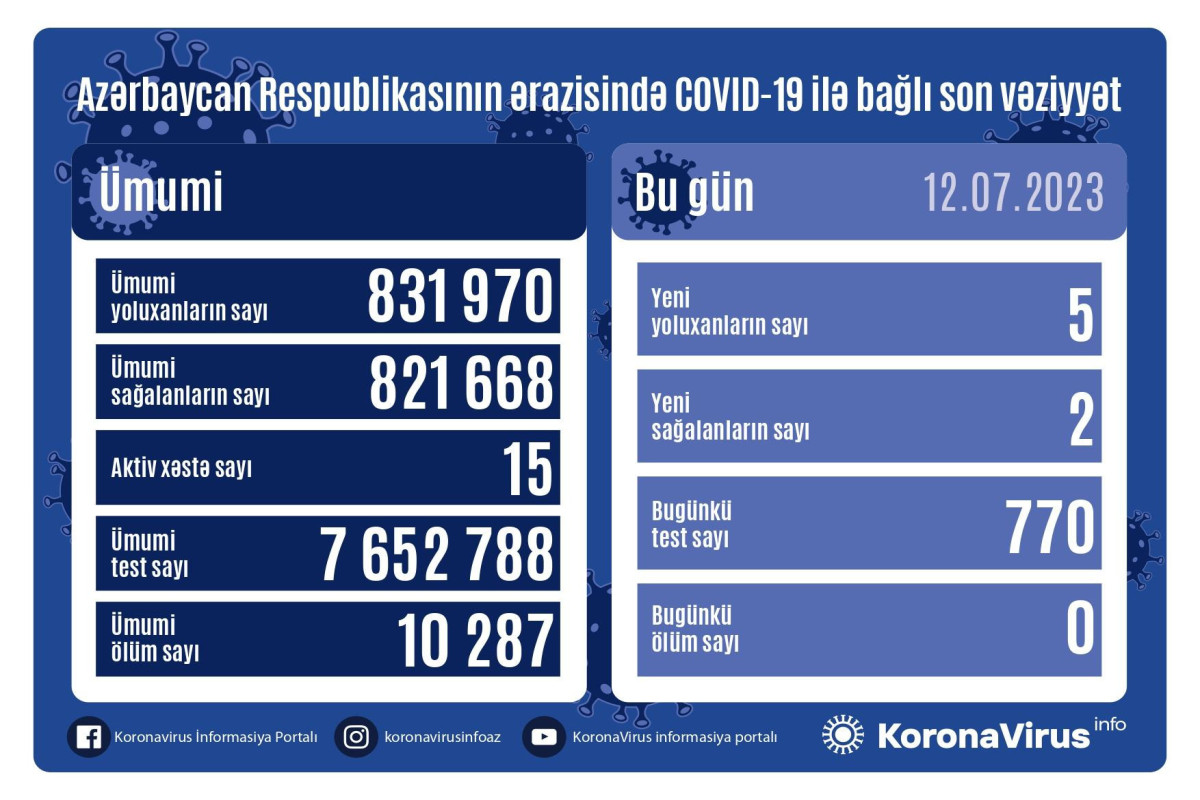 Azərbaycanda koronavirus (COVID-19) infeksiyasına 5 yeni yoluxma faktı qeydə alınıb, 2 nəfər müalicə olunaraq sağalıb.