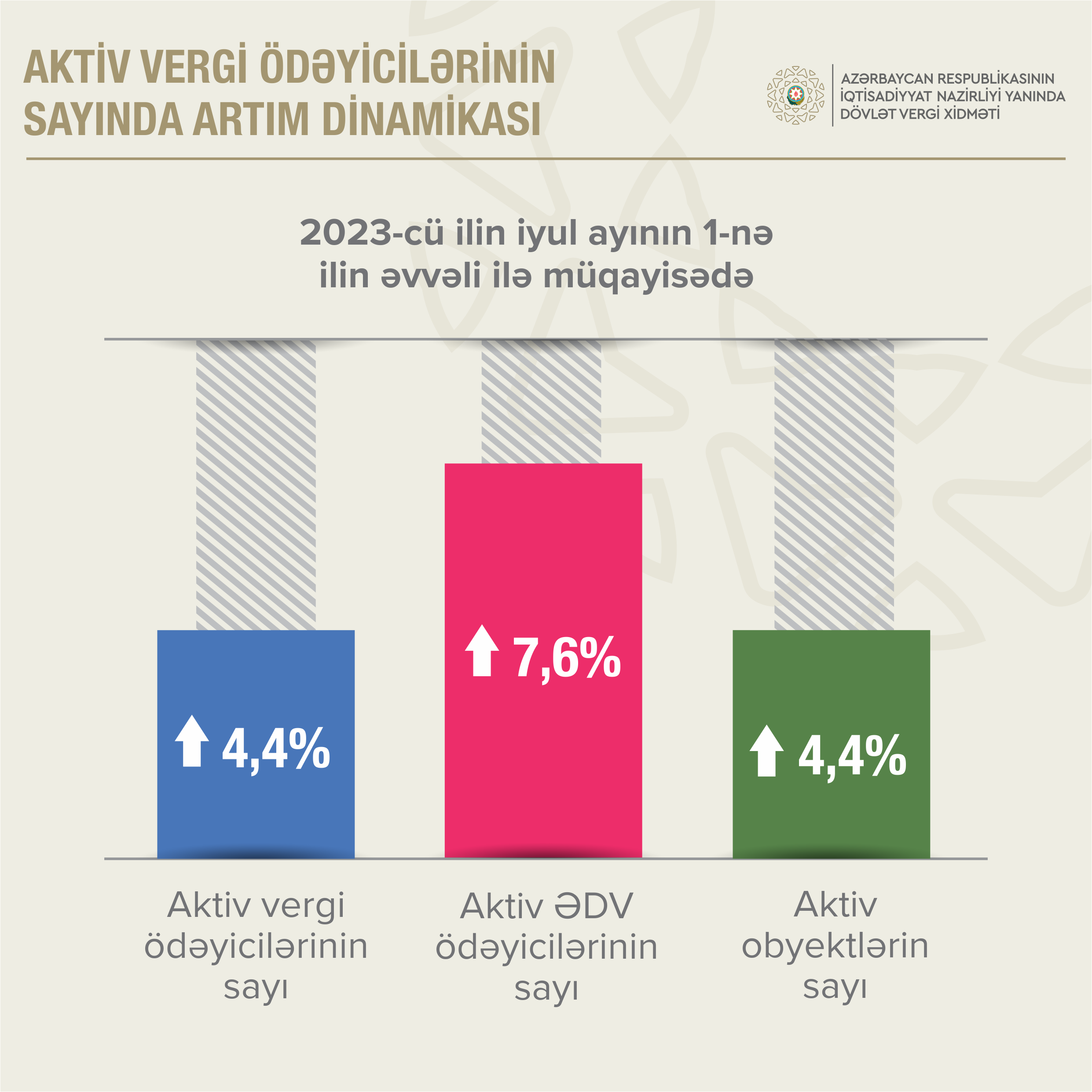 İyul ayının 1-nə ölkədə aktiv vergi ödəyicilərinin sayı ilin əvvəli ilə müqayisədə 4,4 faiz artaraq 743,3 min olub.