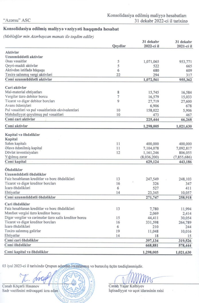Marja.az xəbər verir ki, ötən ilin zərəri daxil "Azərsu" şirkətinin yığılmış zərəri 8 milyard 36 milyon 200 min manata çatıb. 2021-ci ilin sonunda şirkətin yığılmış zərəri 7 milyard 855 milyon 686 min manat təşkil etmişdi.
