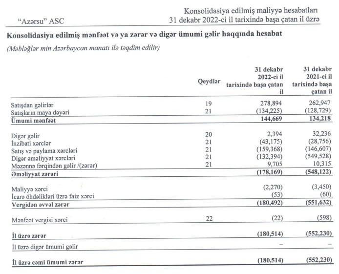 "Azərsu" ASC 2022-ci ili 180 milyon 514 min manat xalis zərər ilə başa vurub. Şirkət 2021-ci ili 552 milyon 230 min manat xalis zərər ilə bağlamışdı. Beləliklə, "Azərsu" şirkətinin xalis zərəri 2021-ci illə müqayisədə 2022-ci ildə 371 milyon 716 min manat və ya 67,3% azalıb. Xalis zərərin azalmasının əsas səbəbi digər əməliyyat xərclərinin 4,1 dəfə azalaraq 2021-ci ildəki 549 milyon 528 min manatdan 132 milyon 394 min manat düşməsi ilə əlaqədardır.