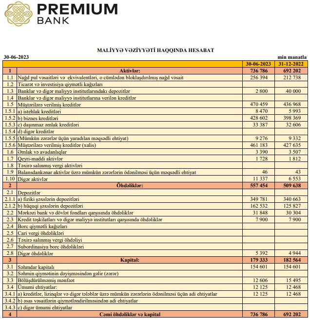 "Premium Bank"ın cəmi aktivləri ötən ilin sonu ilə müqayisədə 6,4% artaraq 30 iyun 2023-cü il tarixində 736 milyon 786 min manat təşkil edib. Bankın kredit portfeli (müştərilərə verilmiş kreditlər) 7,7% artaraq 470 milyon 459 min manata yüksəlib.