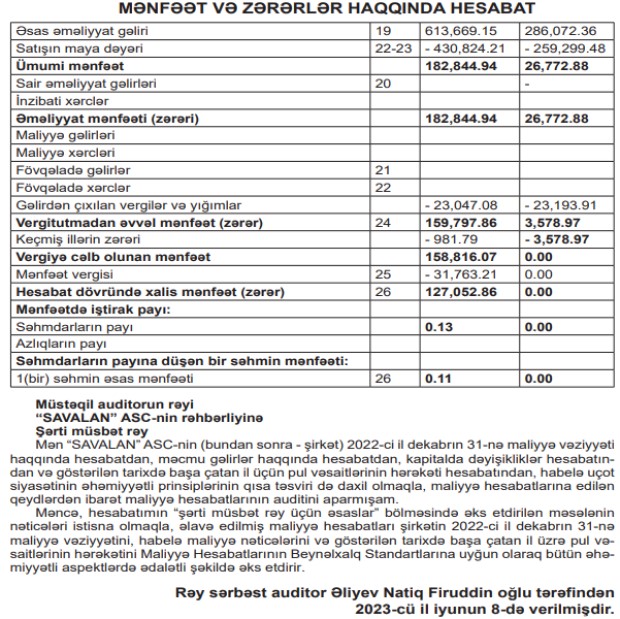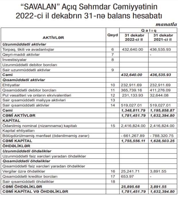 "Savalan" ASC 2022-ci ili 127 min manat xalis mənfəət ilə başa vurub. 2021-ci ildə Şirkət nə mənfəət, nə də zərər etmişdi.