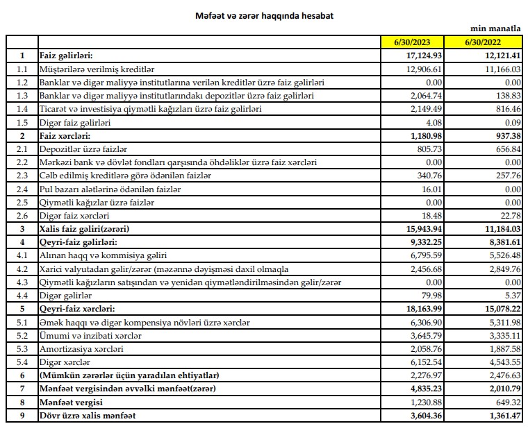 "Yapı Kredi Bank Azərbaycan" QSC 2023-cü ilin birinci yarısını (yanvar-iyun) 3 milyon 604 min manat xalis mənfəət ilə başa vurub. Bank ötən ilin eyni dövrünü 1 milyon 361 min manat xalis mənfəət ilə bağlamışdı. Beləliklə, "Yapı Kredi Bank Azərbaycan"ın xalis mənfəəti 2023-cü ilin birinci yarısında 2022-ci ilin birinci yarısı ilə müqayisədə 2 milyon 243 min manat və ya 2,6 dəfə artıb. Xalis mənfəətin artması gəlirlərin artmasından qaynaqlanır.