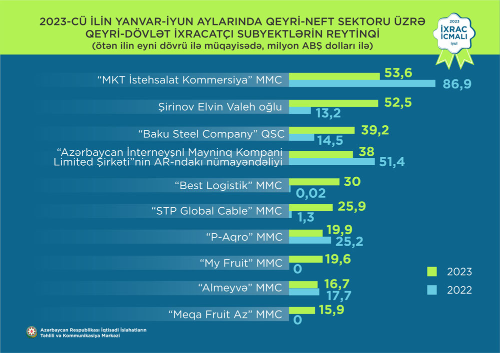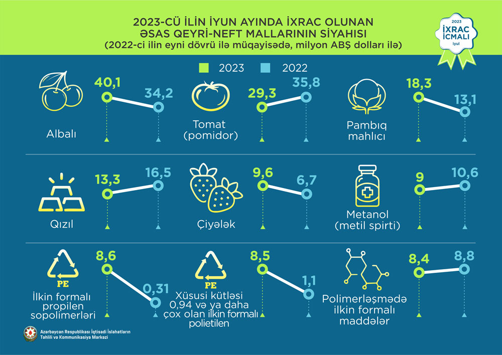 2023-cü ilin iyun ayında ixrac edilən qeyri-neft sektoruna aid malların siyahısında albalı və gilas (40,1 milyon ABŞ dolları) birinci, pomidor (tomat) (29,3 milyon ABŞ dolları) ikinci və pambıq mahlıcı (18,3 milyon ABŞ dolları) üçüncü olub.